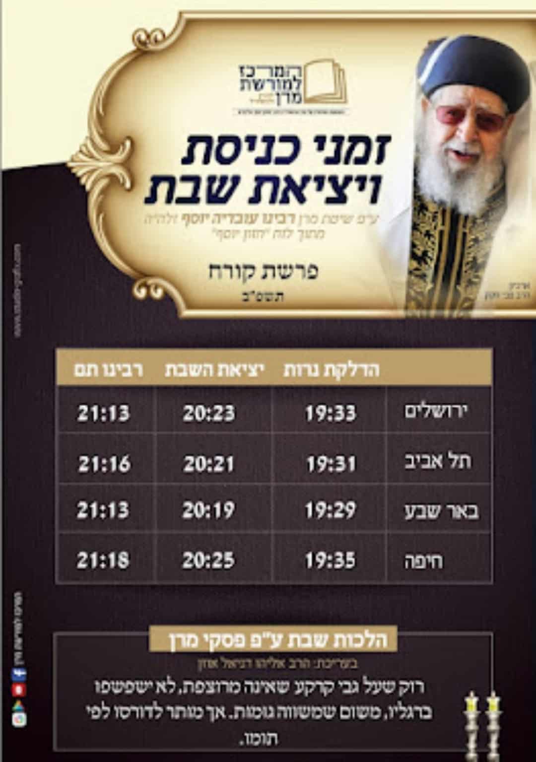 מידי שבוע "המרכז למורשת מרן – להבין ולהשכיל" מפרסם את זמני השבת ע"פ שיטת "מרן רבינו עובדיה יוסף זיע"א" וכן מצורף הלכה אחת מהלכות שבת מתוך ספריו של מרן זיע"א