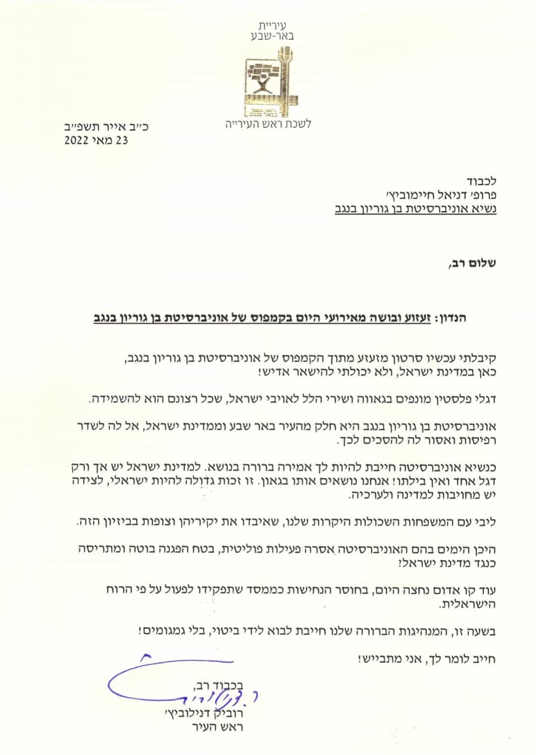 ראש עיריית באר שבע דנילוביץ' שלח מכתב זועם לנשיא אוניברסיטת בן גוריון בעקבות ההפגנת בו כתב "האוני' היא החלק מהעיר באר שבע וממדינת ישראל. אל לה לשדר רפיסות ואסור לה להסכים לכך… כנשיא האוני' חייבת להיות לך אמירה ברורה בנושא. למדינת ישראל יש רק דגל אחד ואין בילתו!"