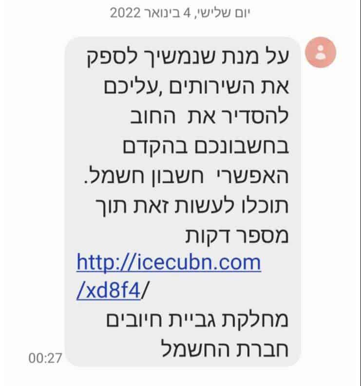 באמצעות מסרון שקרי הקורא ללקוחות ״להסדיר את חובם״ באמצעות קישור המוביל לתשלום בכרטיס אשראי
