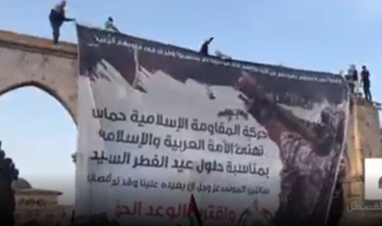 בשלט הגדול שנתלה במתחם הר הבית אחרי תפילת החג נכתב: "חמאס מברך את האומה הערבית והאסלאמית לרגל חג אל פיטר". ברקע נראה איש הזרוע הצבאית של הארגון עם נשק