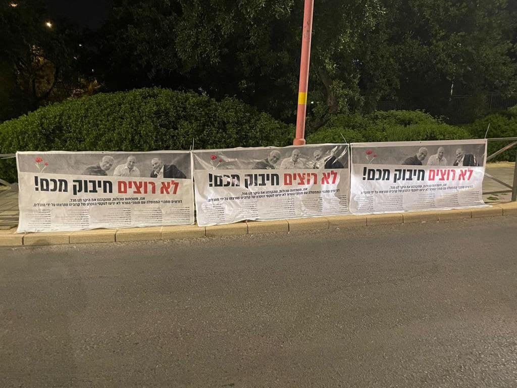 ‏משפחות שכולות תלו שלטים הלילה בעשרות צמתים ומרכזים בירושלים שבהם נכתב, ״לא רוצים חיבוק מכם״