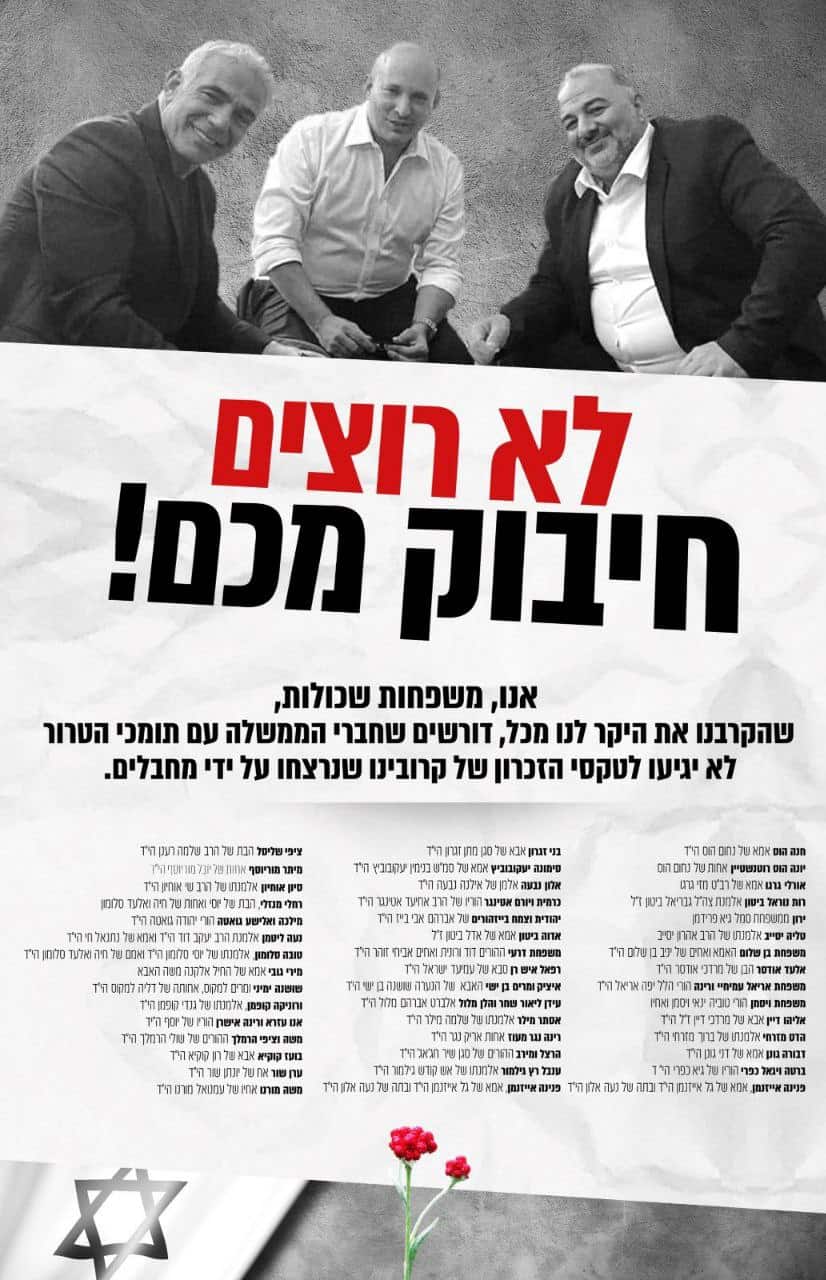 המשפחות השכולות שאיבדו את יקיריהם בפעולות טרור ובמערכות ישראל, ובו קריאה לשרי הממשלה שלא להגיע לטקסי הזיכרון של יקיריהם ביום הזיכרון