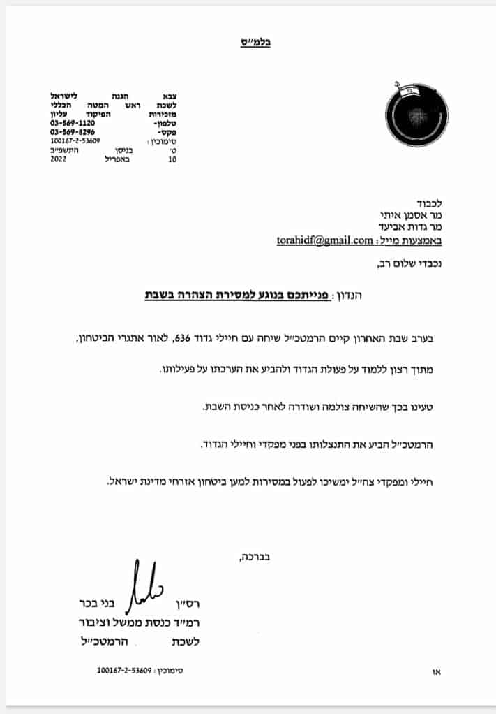 לסיום כתבו “זכות שמירת השבת תצטרף לזכויות הרבות שלך ושל צה”ל כולו – בקיום מצוות עזרת ישראל מיד צריו ובהגנה על מדינתנו מדינת ישראל.”