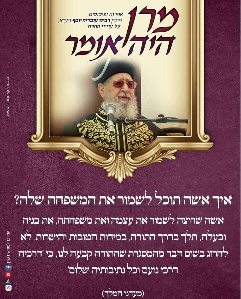 כמידי יום שלישי "המרכז למורשת מרן מפרסמים אמירה וציתות ממרן רשכבה"ג רבינו עובדיה יוסף זיע"א והשבוע בנושא "איך אישה תוכל לשמור את המשפחה שלה"